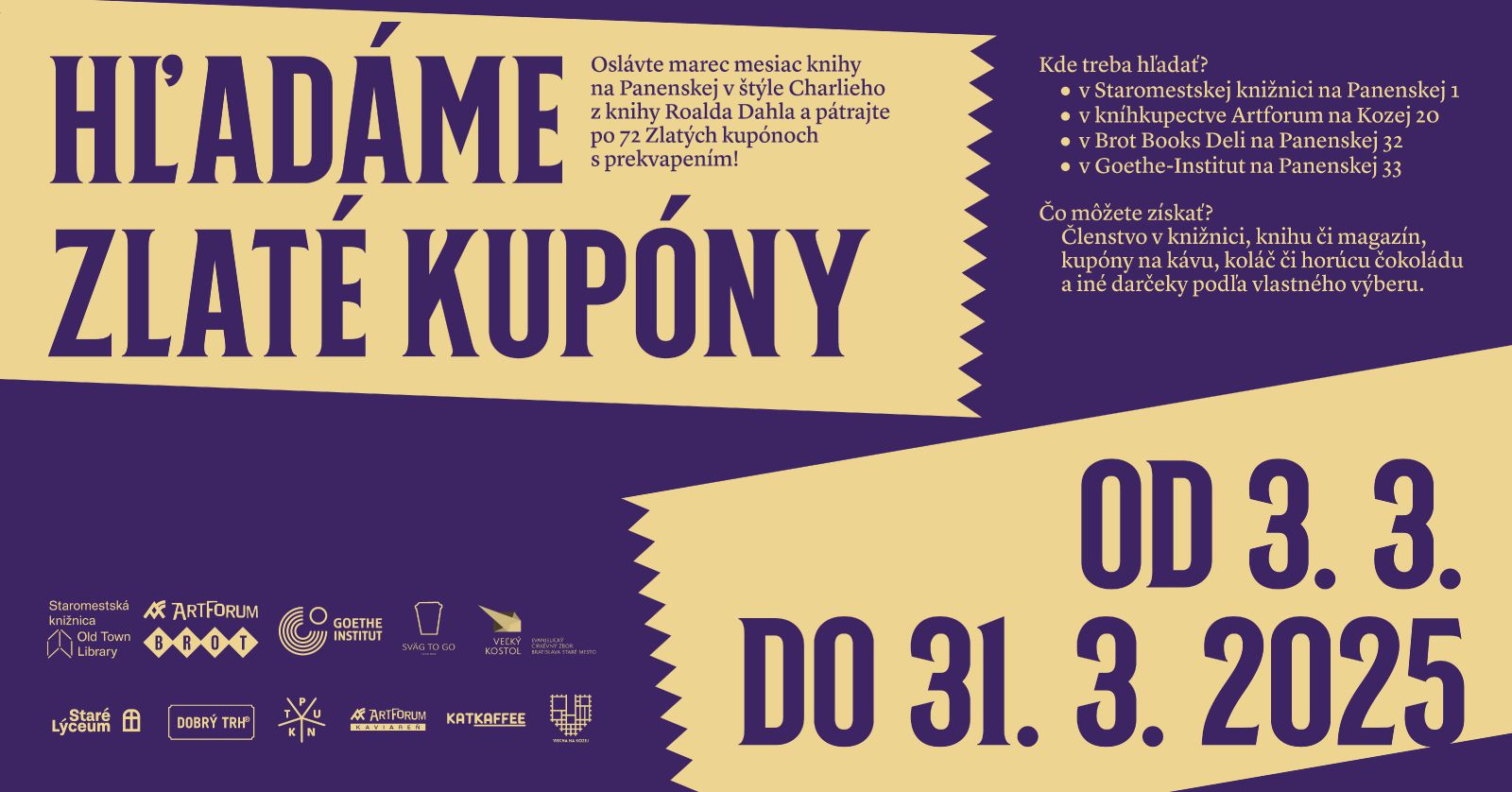 Якщо протягом березня ви завітаєте до Староміської бібліотеки, книгарень Artforum та Brot Books Deli чи до Goethe-Institutu на Паненській вулиці, у вас буде шанс натрапити на один із 72 Золотих купонів. Якщо знайдете — уважно прочитайте, що саме ви виграли: це може бути книжка, журнал, кава чи шоколадка, келих вина, вхід на подію або інший приємний подарунок.